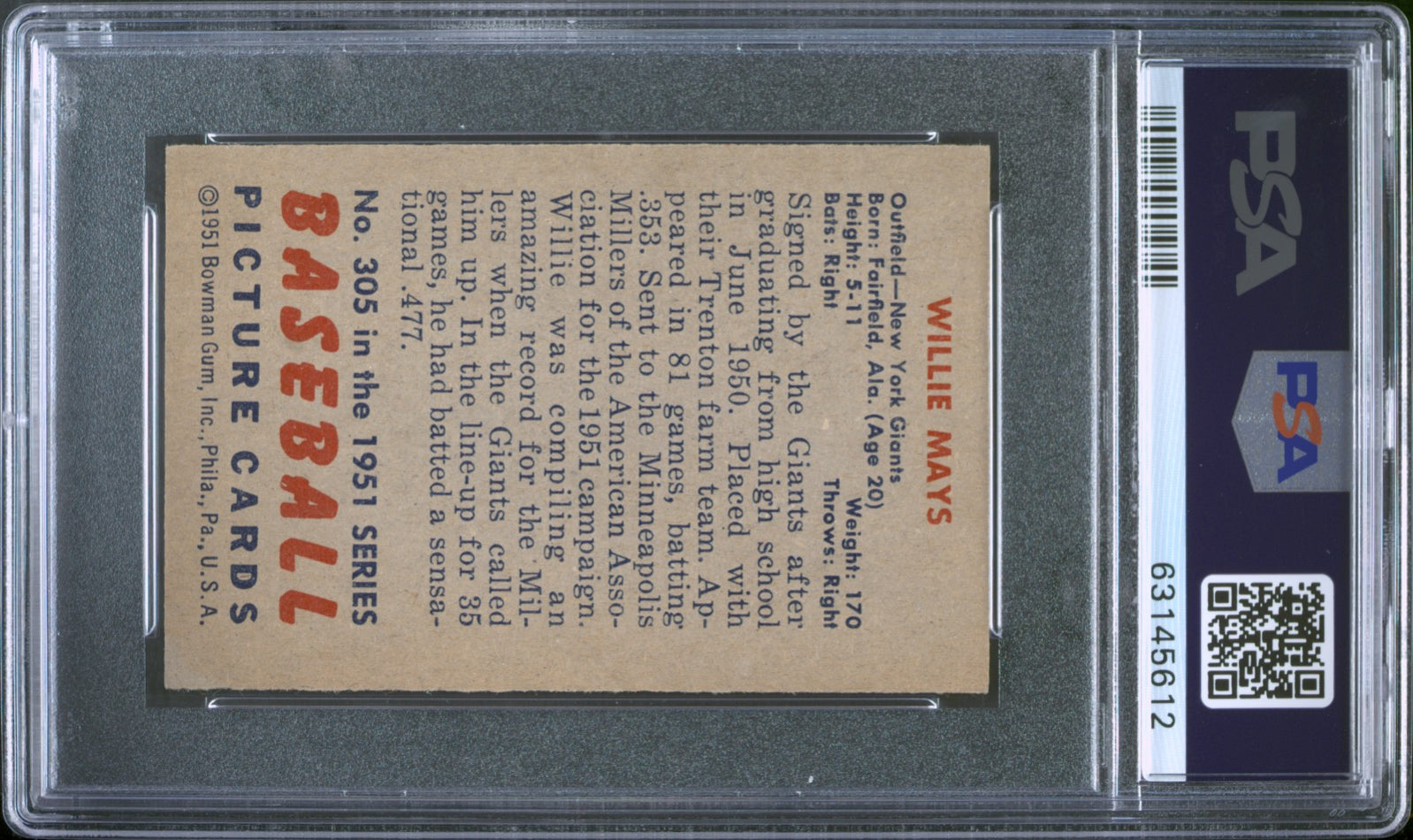 You are purchasing a 1951 Bowman Willie Mays #305 PSA 6.