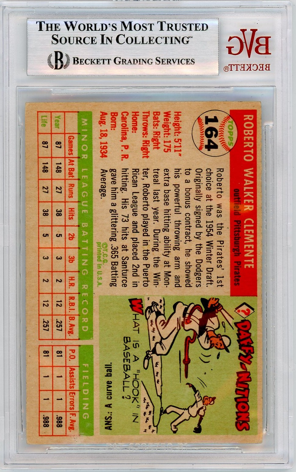 You are purchasing a 1955 Topps Roberto Clemente #164 BVG 6 Rookie.
