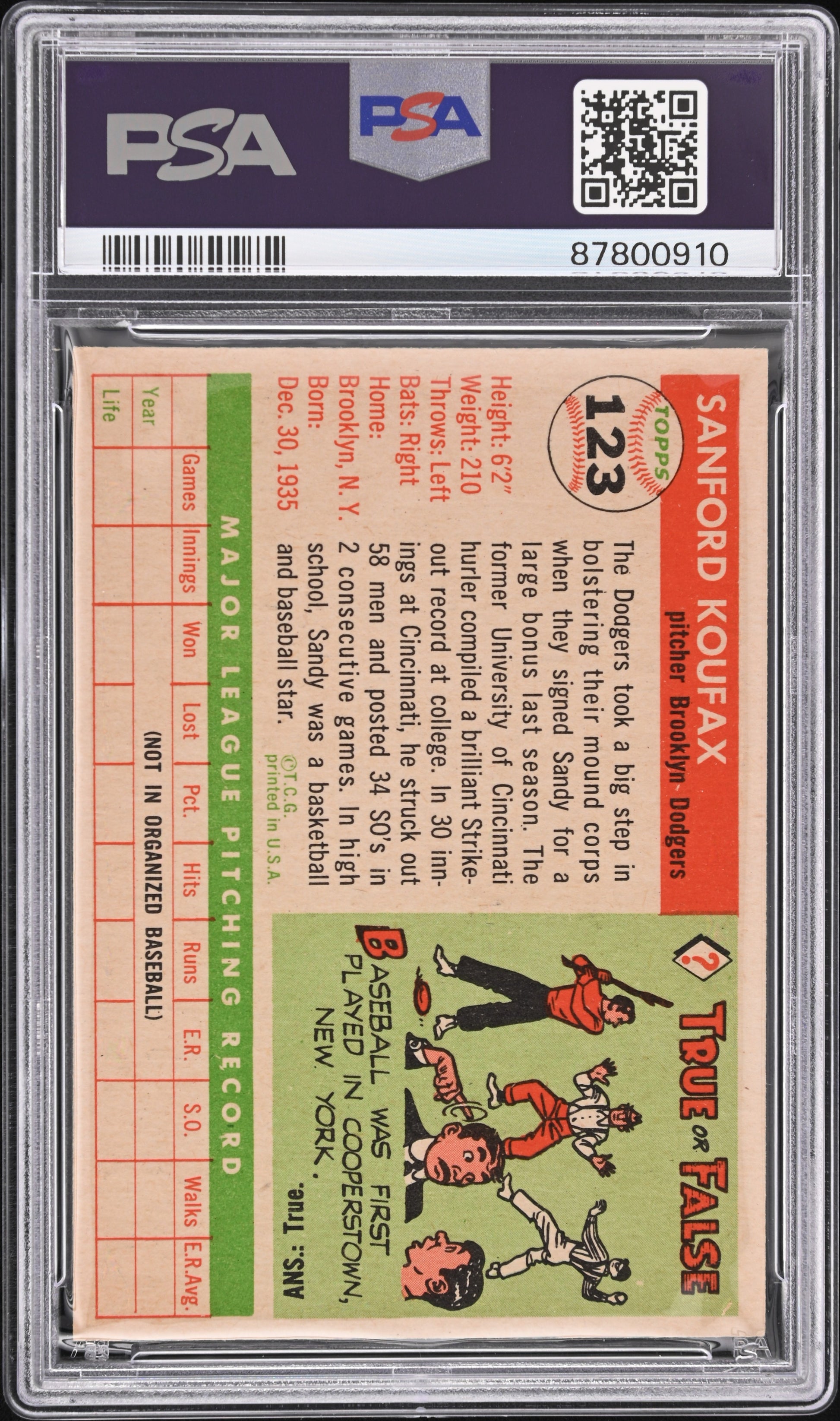 You are purchasing a 1955 Topps Sandy Koufax #123 PSA 6 Auto 10.