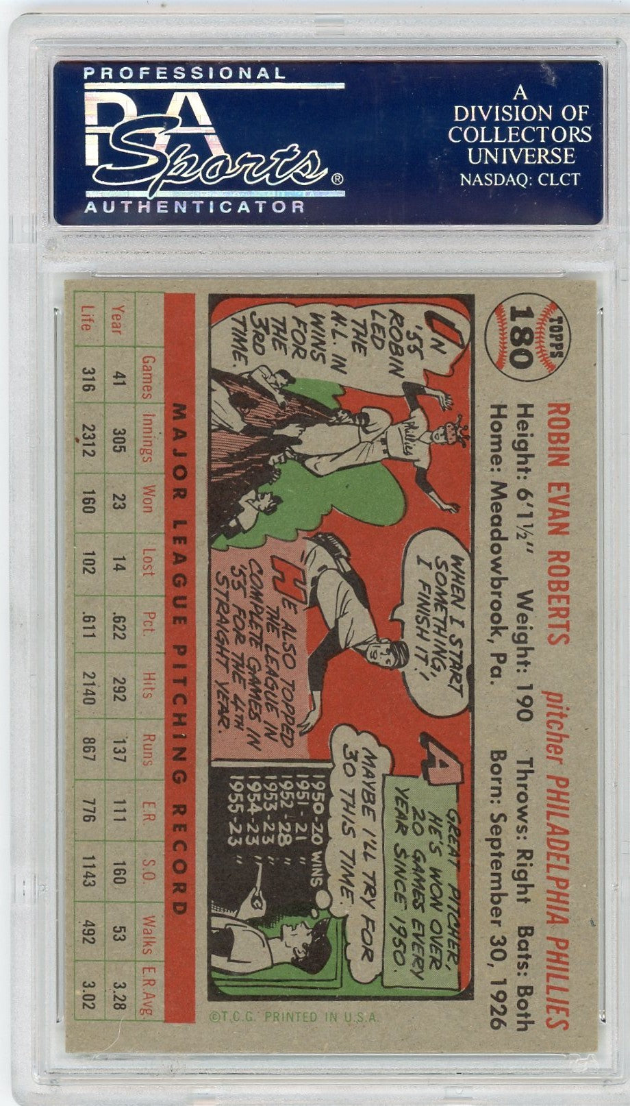 You are purchasing a 1956 Topps Robin Roberts #180 Gray Back PSA 7.