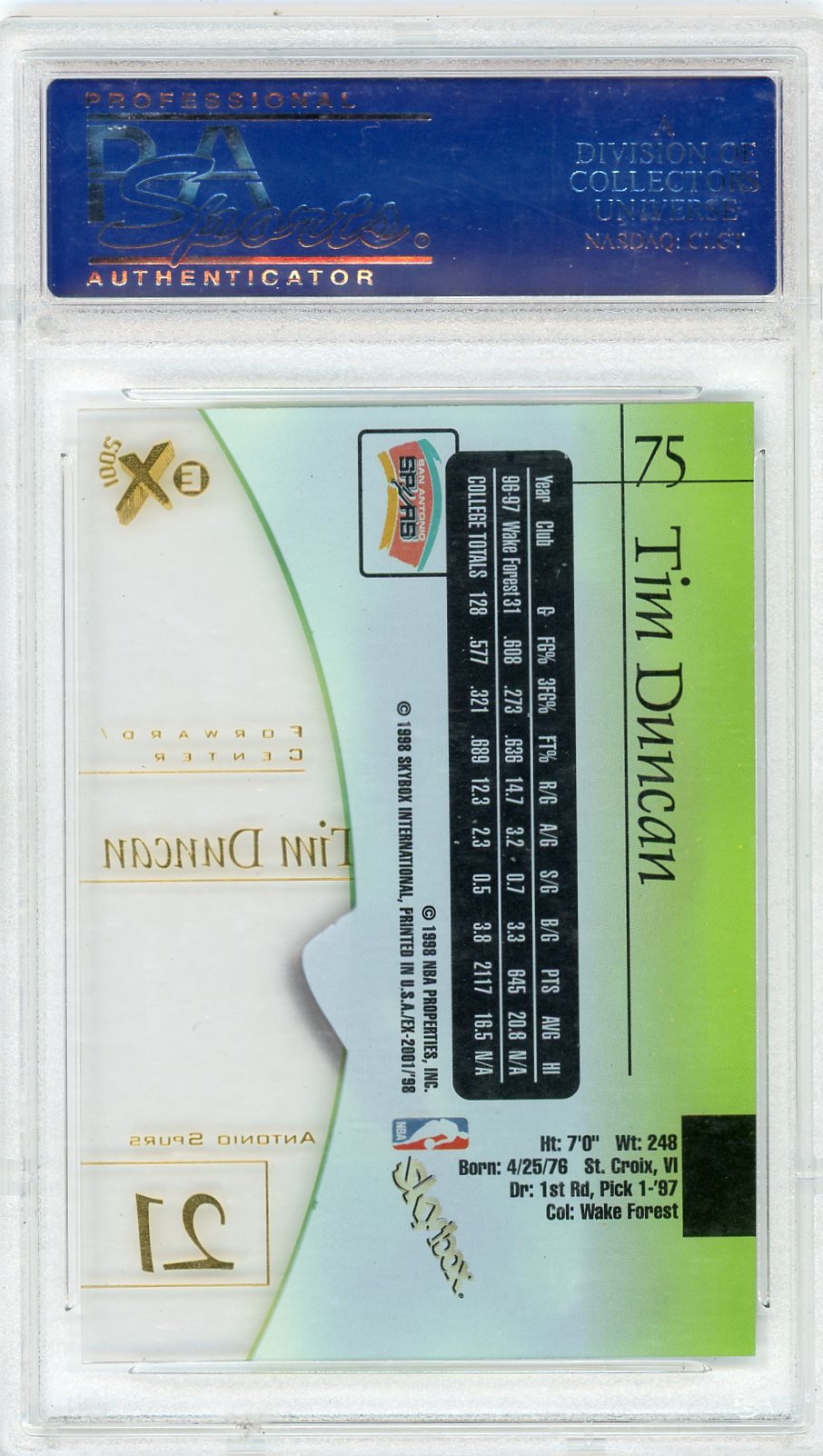 You are purchasing a 1997 Skybox E-X2001 Tim Duncan #75 PSA 10.